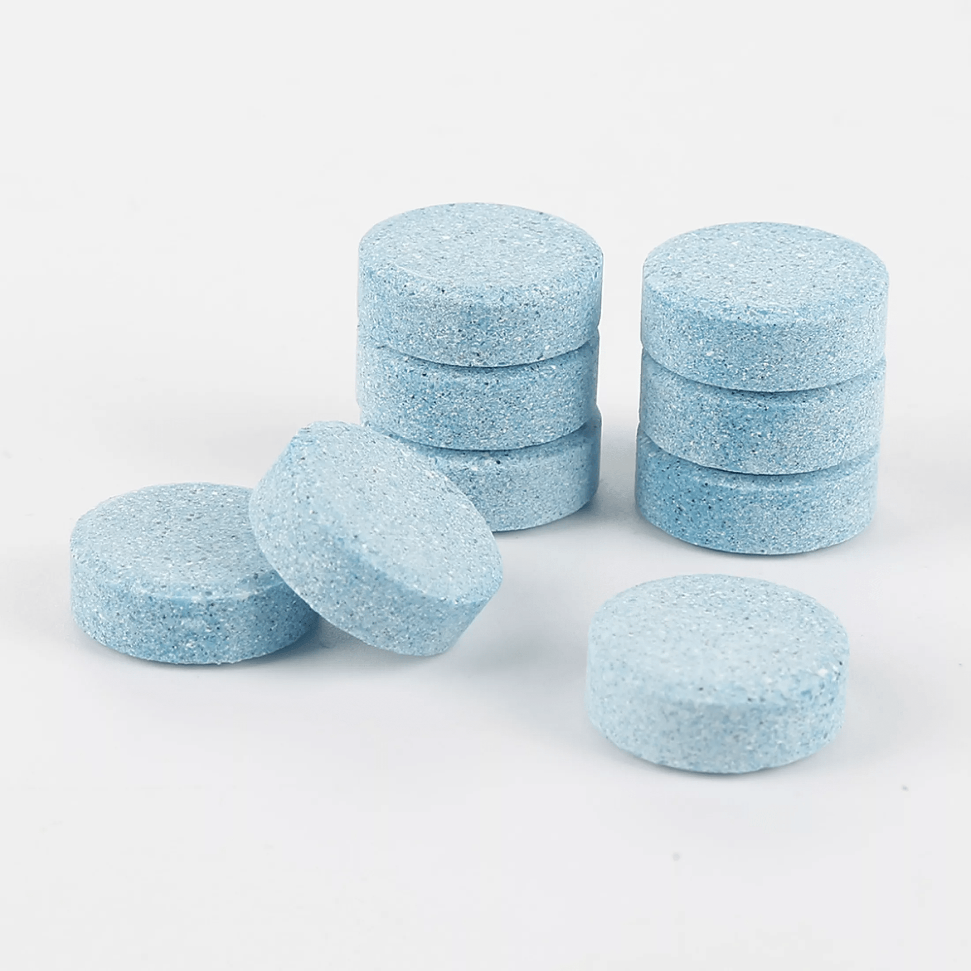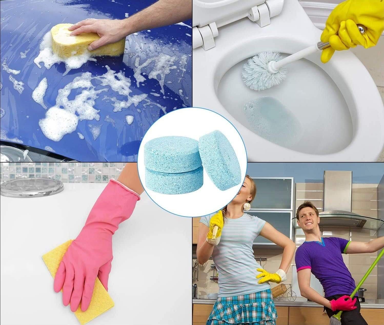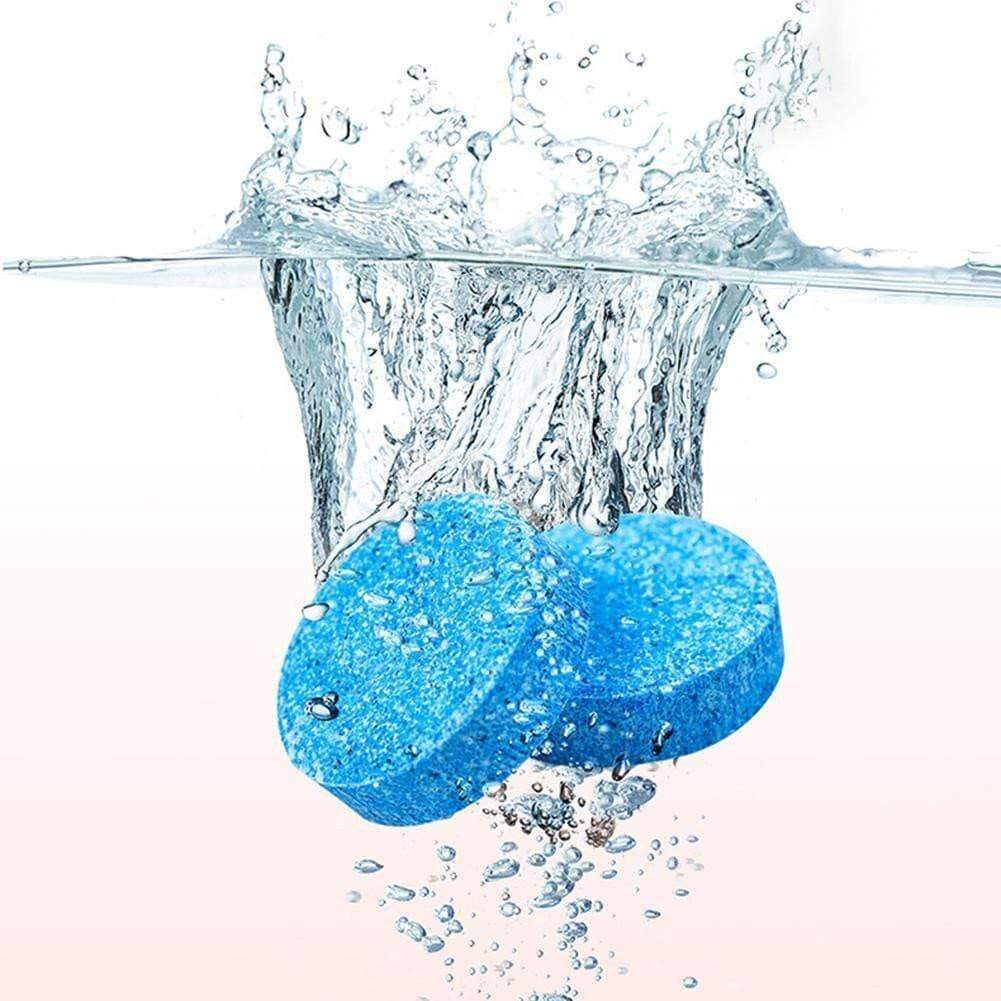 The powerful effervescence tablets dissolve quickly in water to form a blue-colored solution. The solution delivers a strong cleaning punch, effectively removing all the stubborn dirt, grease, and odor without any scrubbing!